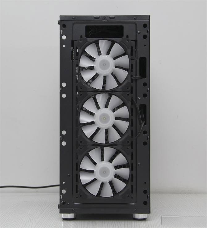 底部120mm风扇 x2(选购),组合成完整风道系统, 另外顶部和底部可容纳120x240mm的水冷散热器,机箱后部预留水冷孔,可谓考虑周全。总结做工可以,挑不出什么毛病,使用唯一问题是机箱高度不够,顶部虽预留有双风扇位,但配合华硕z-170大板,再安装水冷型双风扇cpu散热器后,马甲内存安装不上,高度错一厘米左右,无奈散热器改装至前面板,前面板双风扇改至顶部,由于改变风道,所以cpu风扇改水冷散热器背部,向机箱外抽风效果较好,前面板滤网撕掉利于散热。为提高主机的散热性能,机箱在前面板配备了3个rgb风扇,除了为主机带来更好的散热性能以外,还能让玩家玩转酷炫的rgb灯光效果,预留顶部两个12cm风扇安装位以及机箱背部也预留了1个rgb风扇安装位。