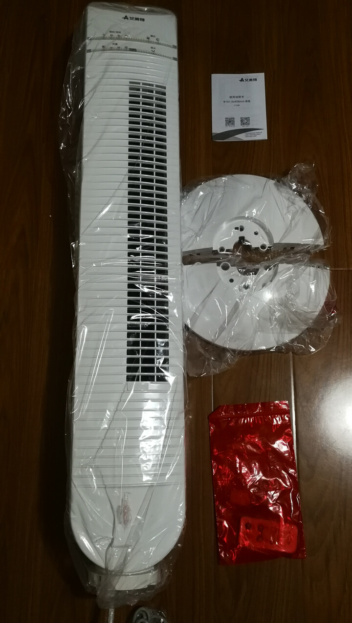 先上一张全家福,扇体、地盘、、说明书等。塔扇组装非常简单,只要安装底盘就行,电源线必须穿过底座空洞,再卡入卡槽,就可以使用了。底盘直径29CM的塔扇站立很稳大厦扇好用吗,轻轻一碰也不容易摔倒。