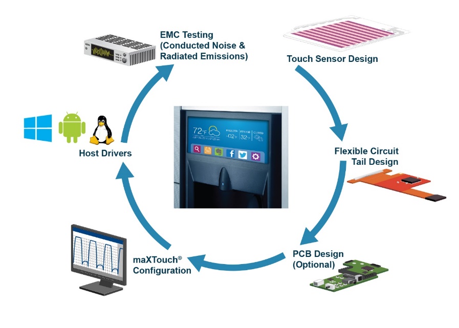 为了尽早了解并提高对触摸屏功能的认识,为电器触摸屏系列中的每个控制器提供指定的评估工具包。该工具包中包括一个带触摸屏控制器的印刷电路板(PCB)、一个无源柔性印刷电路(FPC)的尾部,此尾部可将触摸IC连接到玻璃/塑料透镜上的触摸传感器。该工具包通过USB连接到主机PC,包括所有必需的电缆、软件和文档。