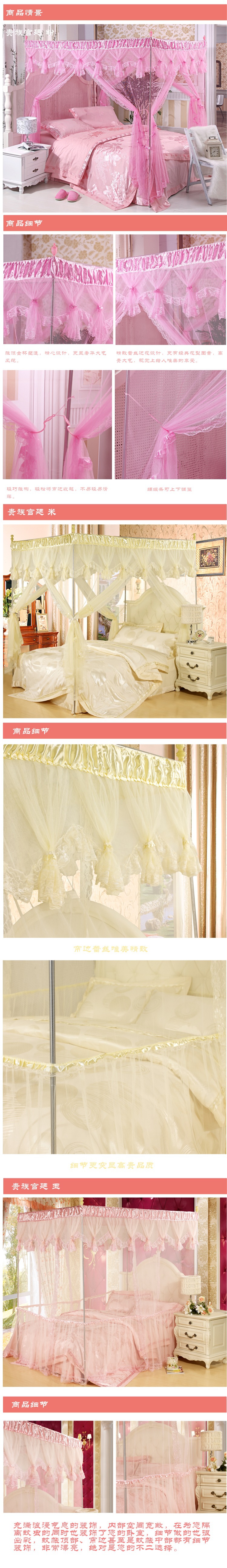 2、方顶四方三开门。宫廷式蚊帐,方顶四方三开门蚊帐相对来蒙古包来说,在样子上看上去更好看一些。优点:样式漂亮。缺点:不太稳定,价格过高。
