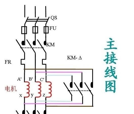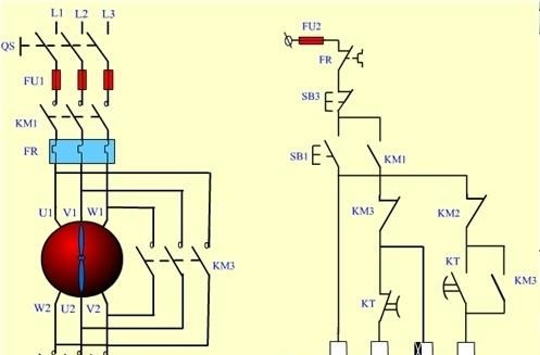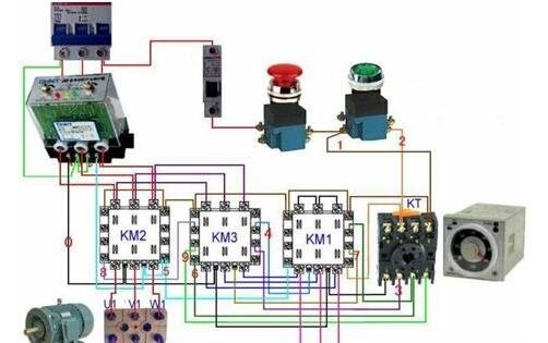 所需的主要组件: 三个交流接触器,一个热继电器,一个时间继电器星三角降压起动接线图,一个启动和停止按钮,两个保险丝