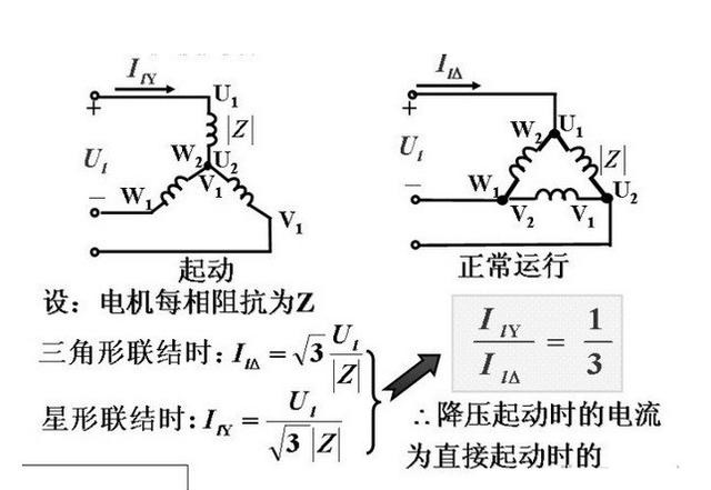 电动机启动时,将定子绕组连接为星形,以降低启动电压和电流. 电动机启动后,将定子绕组变成三角形,以使电动机在全电压下运行.