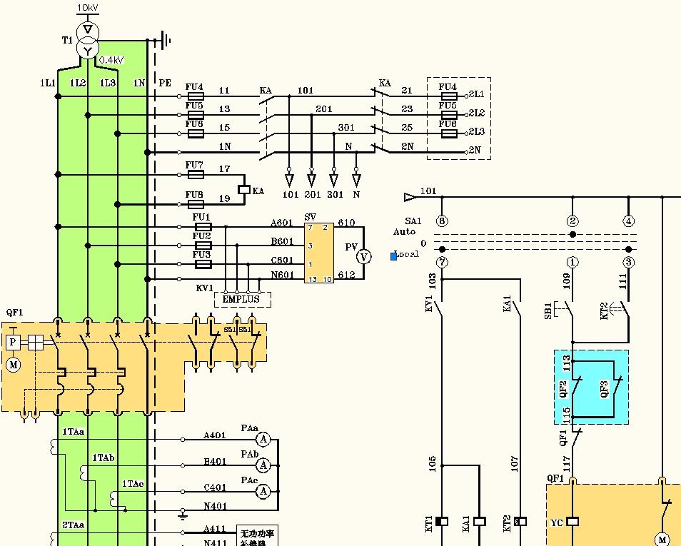 在此图中,左上端是变压器,而其下是主断路器电路和电流互感器电路. 这是传输电能的电路,它是主电路;右边是控制电路,它是次级电路.