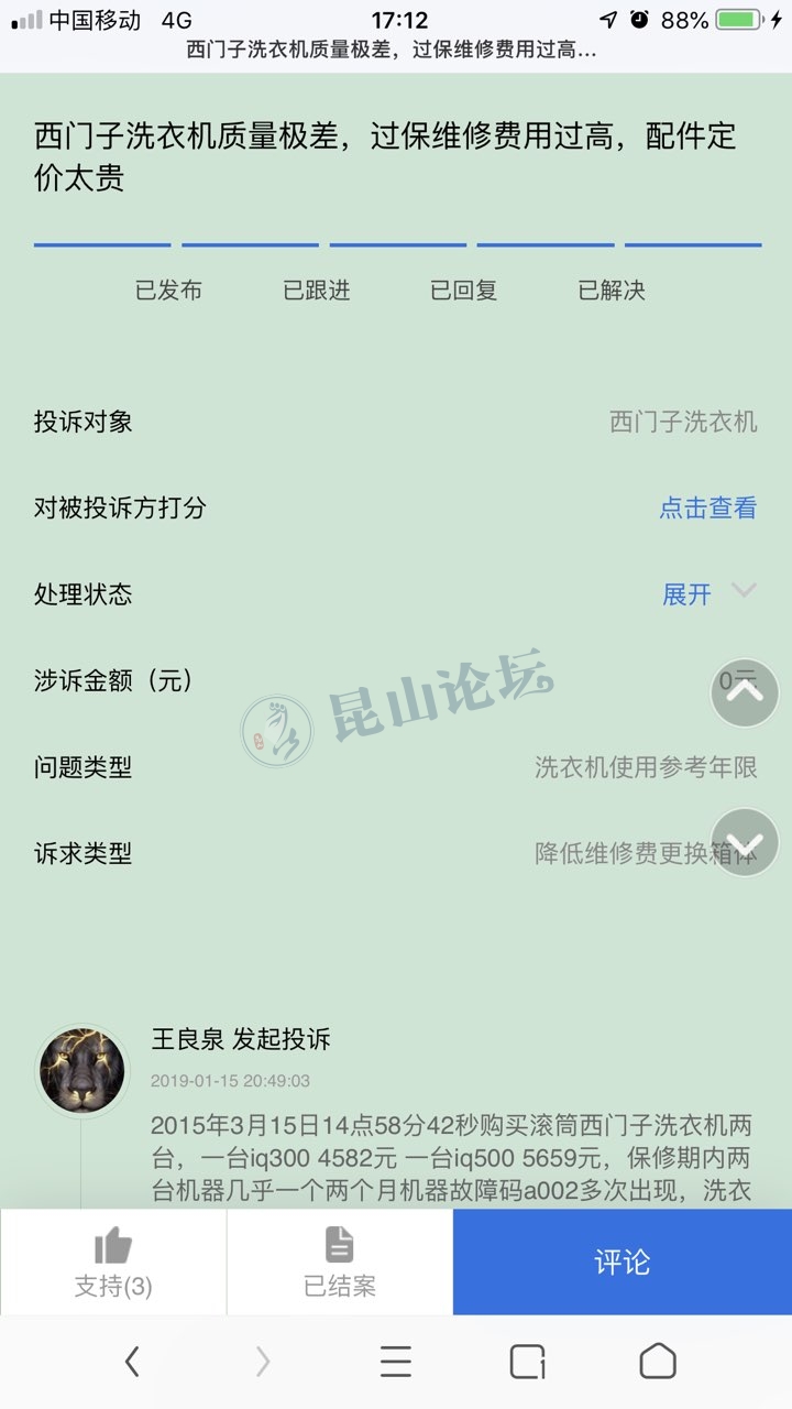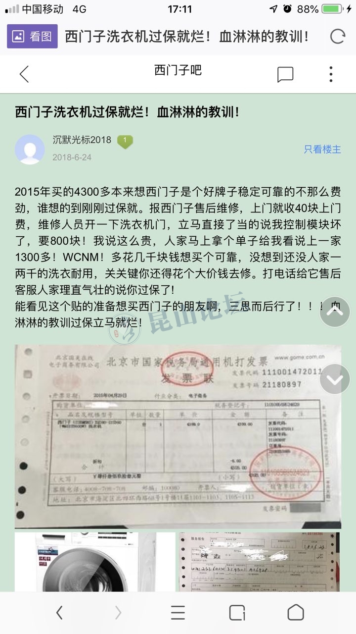 2016年4月,昆山上厦门店购买并安装了Siemens IQ300洗衣机. 保修期为3年. 在此期间,没有人为因素受到破坏. 正常使用和故障发生于2019年4月至2019年5月. 这在洗衣机门关闭后通过旋钮选择程序得以体现. 按下启动按钮后西门子洗衣机保修几年,会发出蜂鸣声,门锁响两次之后,它将继续闪烁,因此无限次重复无响应,无论选择了哪种程序,如何重新打开和关闭门都不会被抬起,请与我们联系. 售后要给维修母带电话,请按照以下步骤进行操作. 母带被告知电话通讯期间主板已损坏,并且他确定这是洗衣机的常见问题. 请注意,船长在没有检查的情况下通知了问题,并以超额保证为由收取了*****费用和更换主板的费用. 与售后服务商进行第二次协商后,师傅到家中确定主板已损坏,说明需要更换西门子洗衣机保修几年,人工费用为660元,并告知维修及配件费用为20元. 员工内部价格的百分比. 在与售后协商后第三次,将再次告知客户可以500美元的价格对其进行修理和更换!