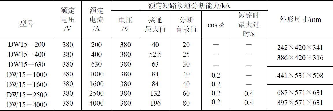 表1-7 DW15系列断路器的技术数据