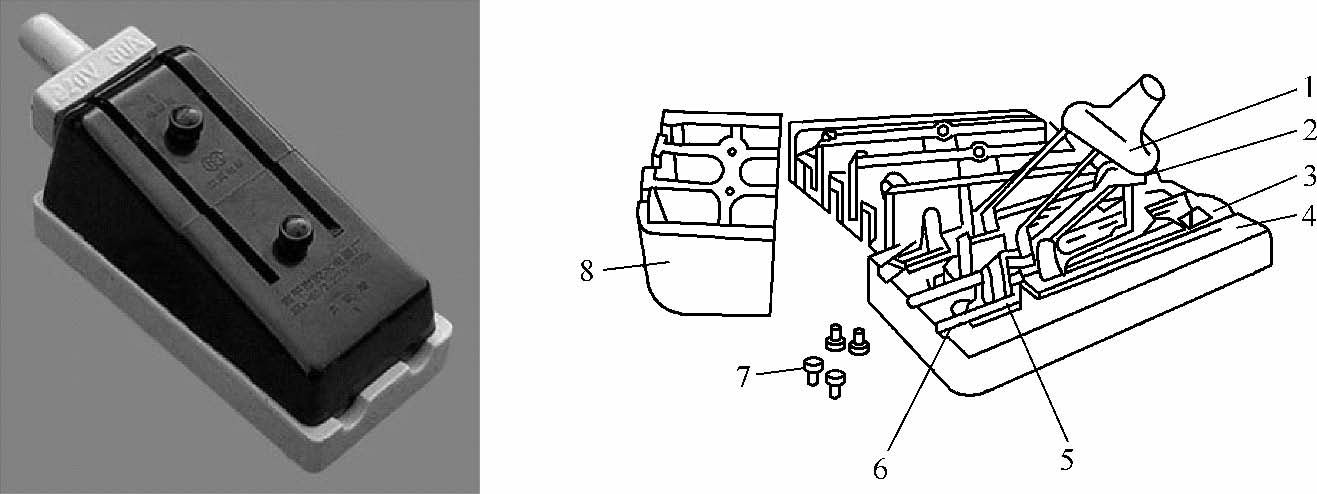 1-陶瓷手柄2-移动触点3-插座底座4-陶瓷底座5-静态触点6-入口电线底座7-塑料帽紧固螺丝8-塑料帽