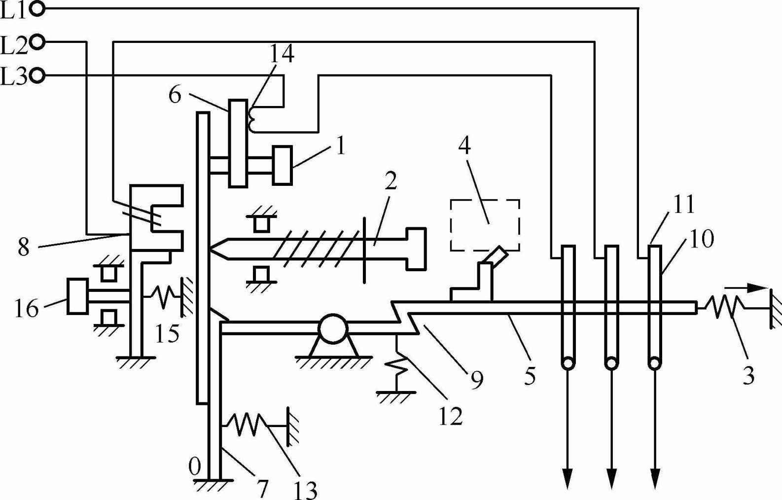 1-热释放设置按钮2-手动释放按钮3-跳闸弹簧4-手动关闭机构5-关闭连杆6-热释放7-锁钩8-电磁释放9-跳闸杆10、11-移动静触头12、13 –弹簧14 –加热元件15 –电磁跳闸弹簧16 –调节按钮