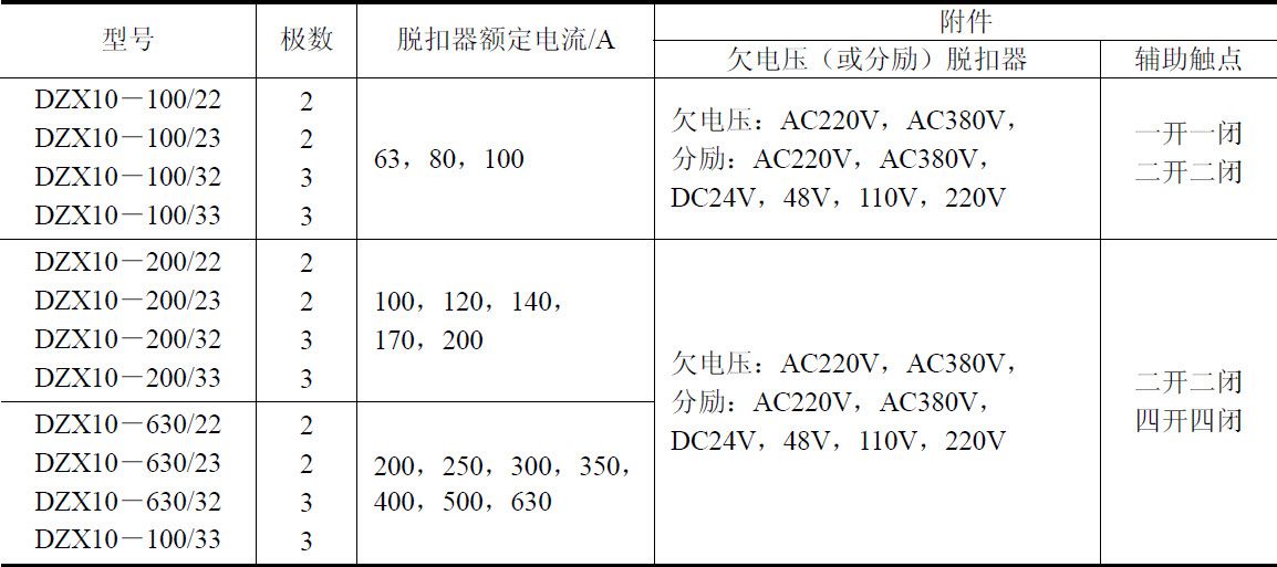 表1-6 DZX10系列断路器的技术数据