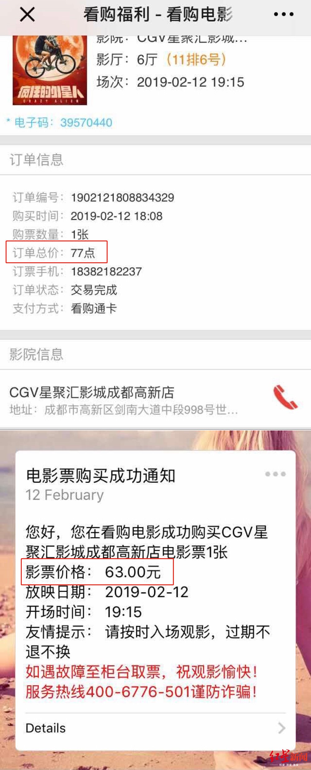 最近,拥有一张看电影会员卡的成都市公民彭女士想去电影院看一部受欢迎的国内电影. 她在当天的18:00从19:15开始通过“观看电影”微信公众号“观看购买优惠”购买了电影票. 电影的观看地点是CGV星菊汇成都高科技商店. 当微信收到“成功购票通知书”时,她看到电影票的价格为63元. 订购信息显示总订购价为77点. “ 63元77分?”她的脑海中闪过一系列问号.