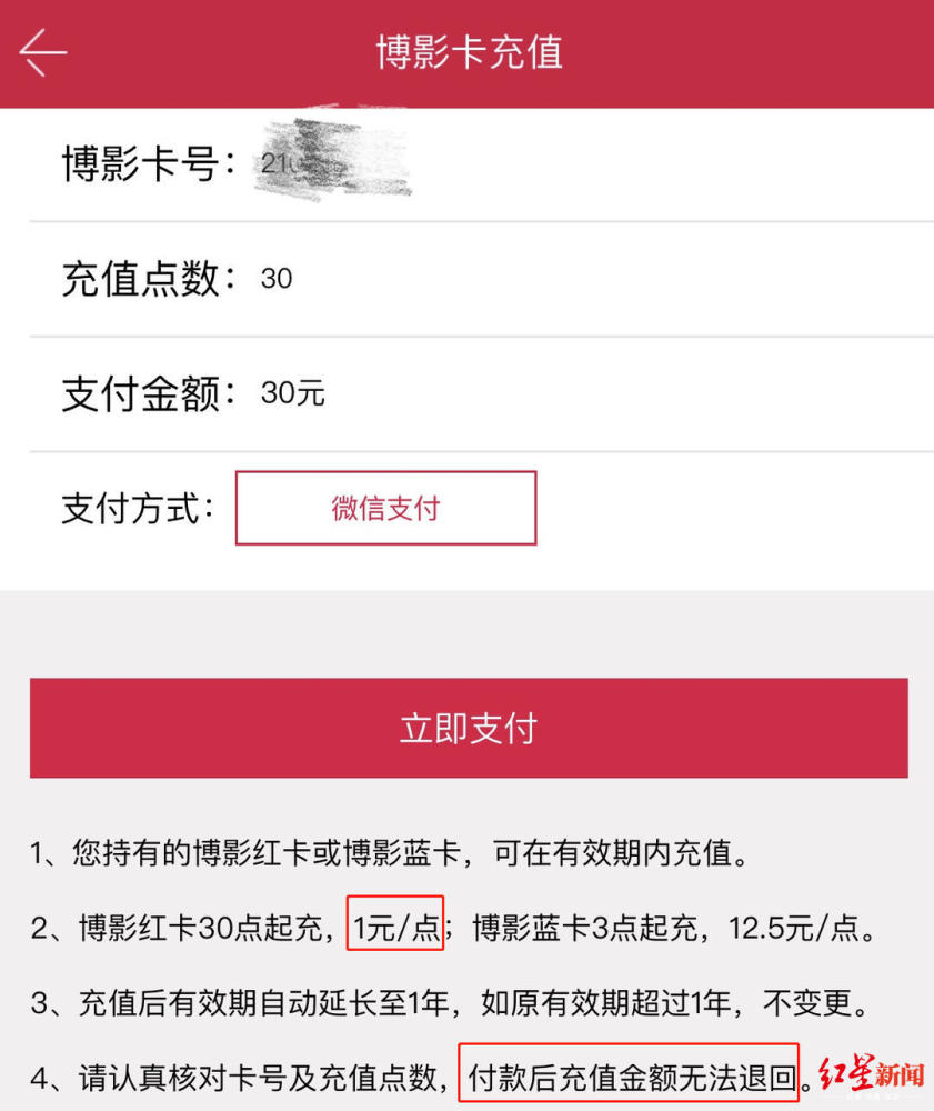 “ Boying”客户服务人员介绍,剩余的积分将不予退还. 像胡先生一样,还剩12点,您可以兑换电影票并弥补差额. 扣除12分后,余下的微信支付. 别无选择. 个人充值1元/点,红卡起价30点. 这种补足差额,补足差额的方式可以确保用完卡中的余额,这是相对划算的.