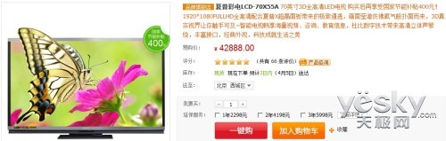 [天津家电频道] [4月2日,苏宁易购新闻]夏普70X55A配备了具有改进的LCD面板性能的UV²A技术和Quattron(桂立通)四色技术,并且可以极大地改善亮度和对比度. 基于“出色的色彩技术”,可将家庭音频和视频享受提升到最高水平. 苏宁易购目前的售价为42888元夏普最便宜4色电视,享受400元的节能补贴后为42488元. 包装中有一副3D眼镜,然后将发送另一副.