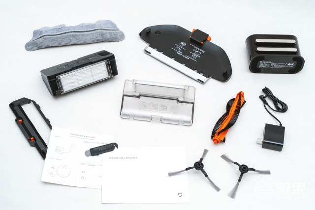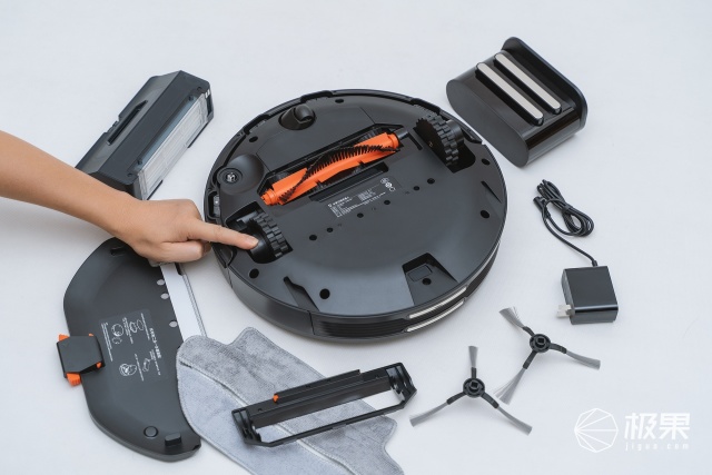 橙色滚筒刷是主刷,三角形是侧刷(仅安装1个),主刷盖固定地压在滚筒刷上. 二合一水箱,拖把架,充电座,电源线.