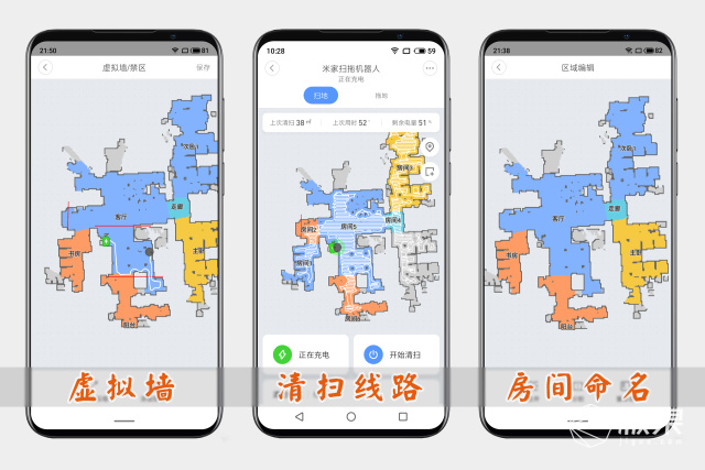 手机屏幕截图1: 在客厅设置两个虚拟墙,以限制Mijia扫地机器人在一个空间中工作;手机2: 整体清洗后的电路图;手机3: 区域编辑,更改房间名称,合并房间. 房间命名和合并房间非常有用,可以使清扫机器人区分房间并清洁各个房间.