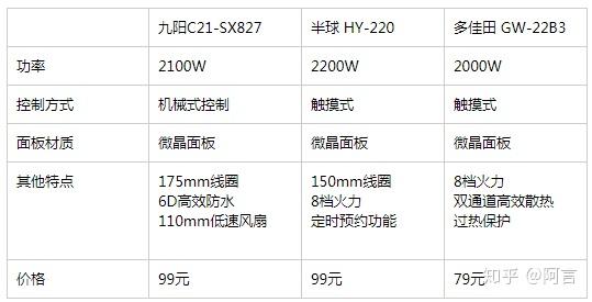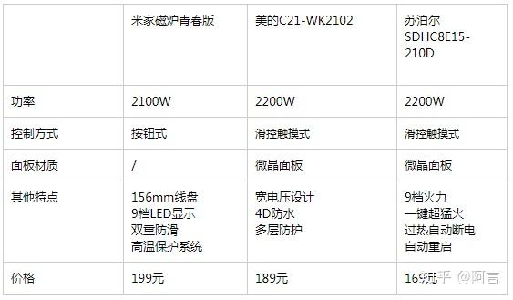100-200元的电磁炉参数比较表(2020年5月制表):