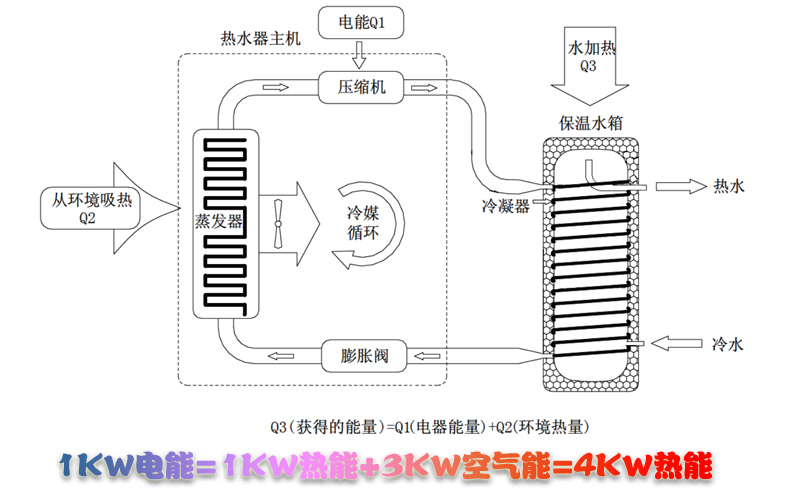 2、空气能热水运用热泵工作原理制热,与空调制冷相反——国家制冷标准是1000瓦,电制冷2800瓦。根据热平衡的原理,同时最少产生2800瓦的热量,加上输入的1000瓦电,实际产生的热量在3000——4000瓦,把这些热量输送到保温水箱,其耗电量只是电热水器的四分之一(电热水器即使热效率100%,输入1000电也只有1000瓦的热)。