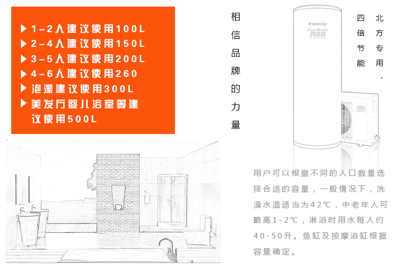 如果一个空气能热水器不具备良好的保温功能它就不是一种真正意义上的空气能热水器。空气能热水器是一种储热式热水器,出水量大,水温一般设定在45℃-55℃。多数的空气能热水器都具有温度保持功能,如水温设定45℃-55℃,温度高于55℃,就自动停机,停止加热,如果水温低于45℃,就自动启动开始加热,使水箱水温保持在55℃以上。水箱保温效果差的热水器,由于热损失大,会经常启动加热。优质的空气能热水器保温层会相对厚一些,而且采用聚氨酯材料,运用成熟的发泡工艺,使水箱中的热水降温更小,起到节约能源的作用,无形中也会省很多电。(温度设置数据仅供参考)
