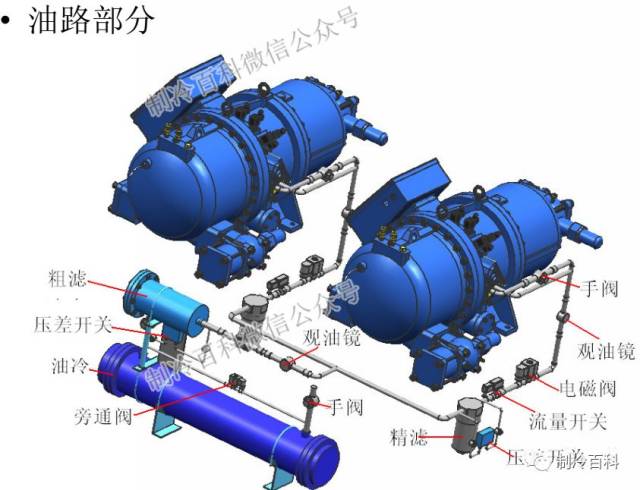 油路主要表现在油质,清洁度螺杆制冷机排气压力低,回油温度和其他润滑剂上. 螺杆压缩机制冷系统中润滑油的主要功能是润滑,冷却和密封.