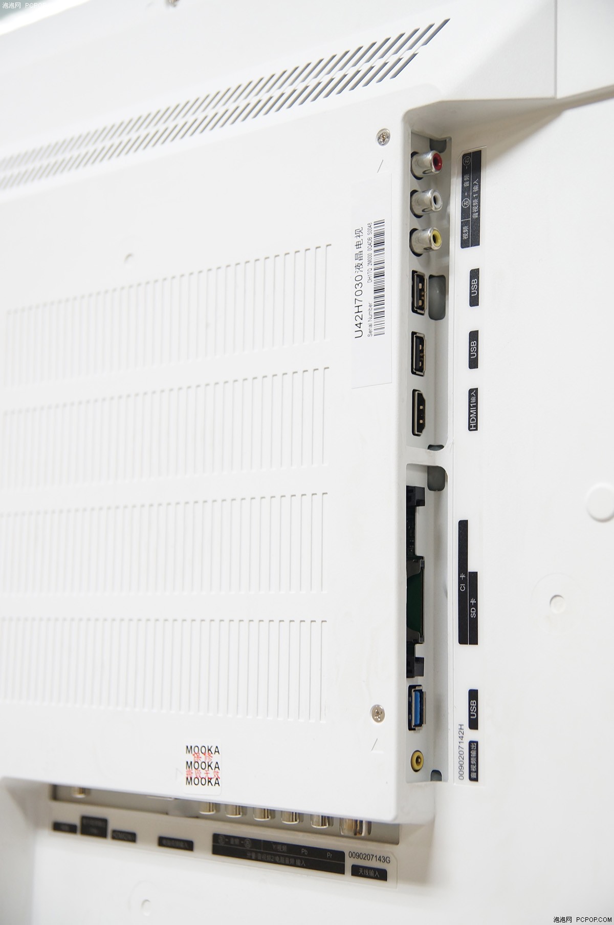 电视的接口区域呈L型分布,不频繁插拔的音视频输入输出横向分布,而USB这类应用更加灵活的扩展接口则分布在机身侧边区域。如果不是靠在电视柜的边缘摆放,不用挪动MOOKA就能为它接驳移动硬盘等周边。