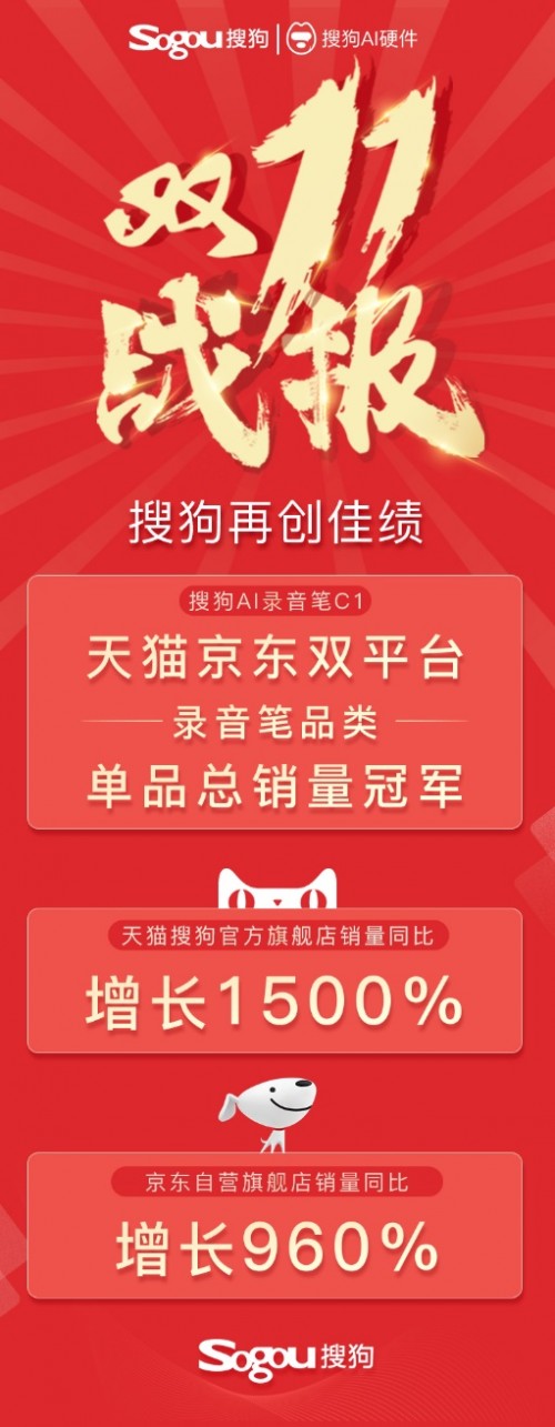 在今年的“双十一”赛事中,搜狗AI记录器C1表现出色. 在录音机类别中,搜狗AI录音机C1赢得了天猫京东双平台单项产品的总销量. 去年,“双十一”上的天猫旗舰店同比增长1500%天猫网录音笔价格,京东的自营旗舰店增长960%. 搜狗AI记录器C1在“双十一”中的销量飙升进一步扩大了其在同类产品中的领先优势.