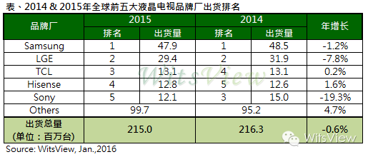 趋势科技光电部门WitsView的最新报告显示,2015年全球液晶电视总发货量为2.15亿台,同比下降0.6%. 这是2013年之后的一年,年发货量再次出现负增长.