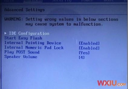 输入BIOS的高级设置. 设置之前,请提醒大家: 新手必须小心设置,因为它直接关系到系统的稳定性和硬件的安全性,因此请勿盲目设置. 从上到下分别是: 系统基本硬件设置联想bios配置程序,Easy-Flash功能选项,内置定点设备设置,数字锁定,声音选项,扬声器音量选项.