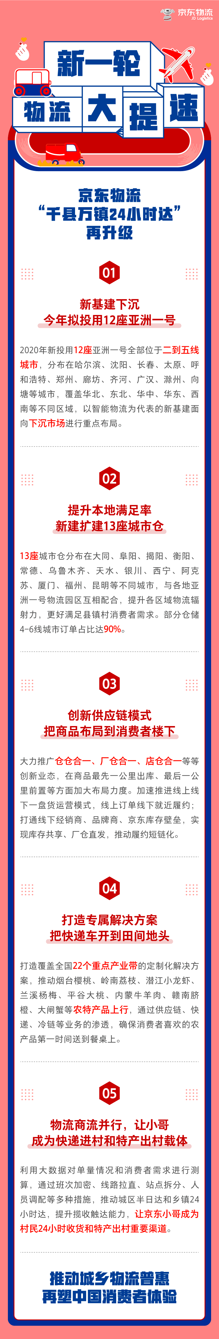 6月8日,京东物流表示,将升级“到2020年千县万乡24小时可达”的及时性改善计划,其中包括新的基础设施沉没,仓储模式的创新,工业皮带的建设,新鲜的冷链物流建设和快递进村等核心措施,继续增强了物流基础设施的能力.