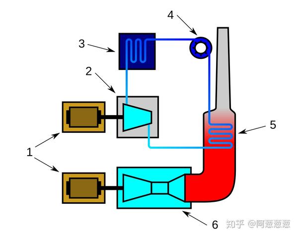 最后,我要说一下联合循环电源. 由于兰金循环的热源的温度不能太高,因此所有人都认为燃气单元和蒸汽单元是串联连接的,如下所示. 图6的燃气轮机是使用布雷顿循环(Brayton Cycle)的,这种循环效率相对较低,并且出口温度非常高. 因此,燃气轮机出口可用于加热2-5的蒸汽轮机.