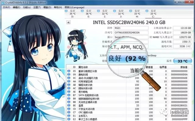 下图显示了使用CrystalDiskInfo来检测Intel SSD的剩余寿命为92%.