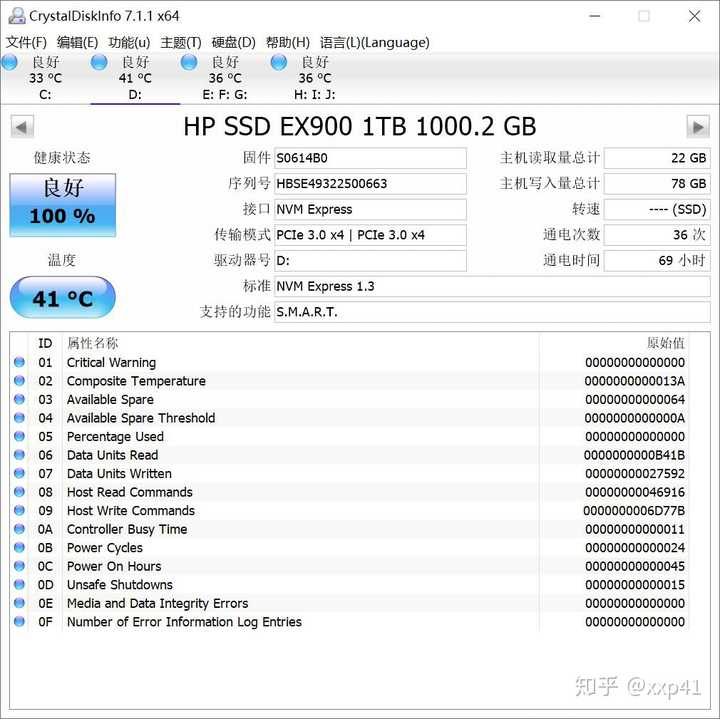 CrystalDiskInfo软件测试: 可以识别出HP EX900系列1TB的传输模式是PCIe 3.0 x4和NVME 1.3技术标准.