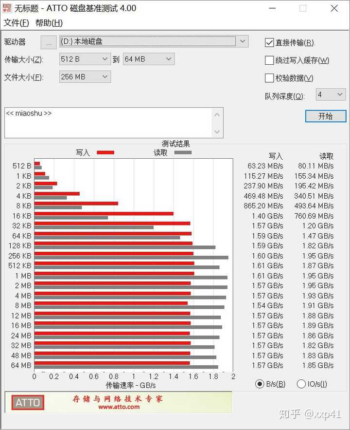 ATTO_Disk_Benchmark软件测试: 最大读取速度约为1.95GB / s,最大写入速度约为1.60GB / s.