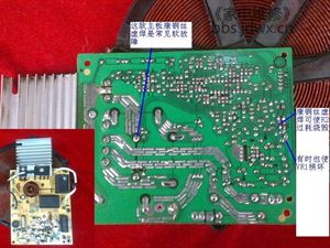 修理:功率管击穿并换好之后,先不要试机,用表分别测一下0.3的谐振电容.5微法滤波电容. 和两只推动管,【用空芯针断开元件一脚测,不必去下元件】,如没问题可通电试机,先不放锅用表测桥堆整流后是否是300伏以上,18伏是否正常,不正常必烧功率管【重要】。放锅时在电源线处卡钳形电流表,【重要】先把电磁炉调至低档,再看电流是否过大,一般品牌机电流最大时8安多一点,其它机不足8安。无名烧功率管的都是电流过大引起的,这是因为电磁炉试用一段时间后,由于尘土. 油泥等引起电路性能降低或是调电流的可调电阻变值引起电流变大了。【重要】