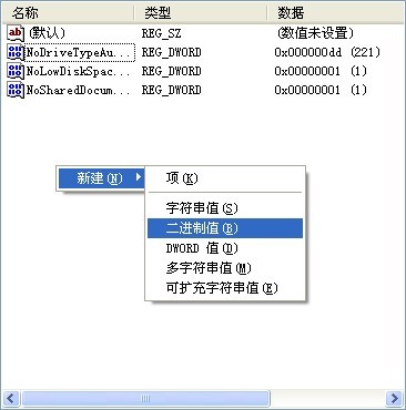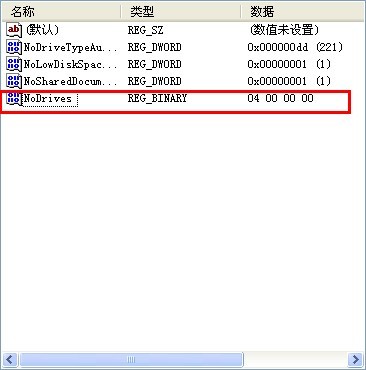 3. 在右侧窗口中创建一个名为“ NoDrives”的新二进制值键. 根据磁盘驱动器的字母顺序(A-Z),从十六进制数的两倍开始增加,然后根据十六进制加法将对应于要隐藏的磁盘驱动器的键值分配给“ NoDrives”. 要隐藏的驱动器隐藏在“我的电脑”中.