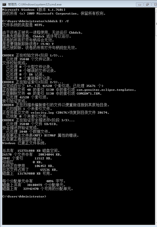 注意: 冒号后面有一个空格. 注意: chkdsk