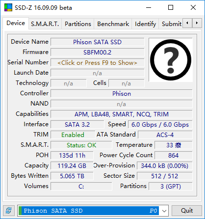 以公共系统磁盘为例. 我的笔记本电脑的系统盘是128G Phison OEM版本的SATA SSD,使用东芝的TLC闪存(Phison封装中的白芯片),而主要控件是Phison PS3110. 该计算机于2016年购买,累计开机时间为3257小时,累计开机时间为864次,累计写入量为5.065TB. 根据TLC的1000倍P / E(128TB),它仍然相距甚远.