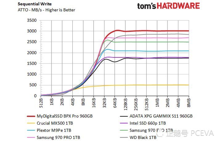 顺序写入速度更为流行,没有人能超过3GB / s的写入速度. 但是PCEVA想要告诉您的是,ATTO测量的顺序写入速度只是SLC缓存的一部分.