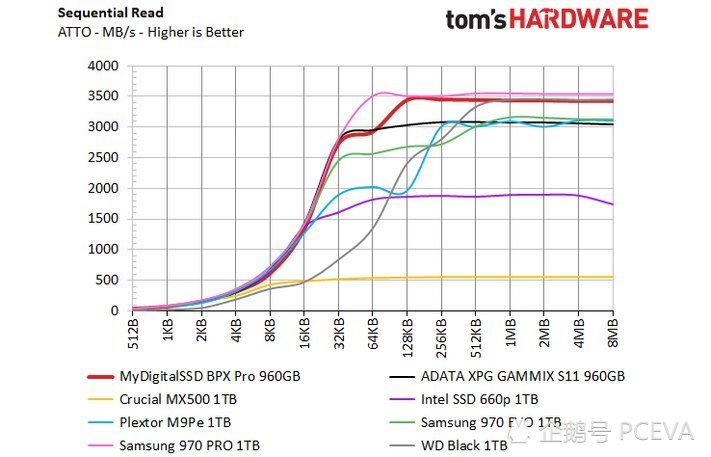 顺序读取和写入速度可以说是BPX Pro的少数几个性能亮点之一. 在960GB型号的ATTO测试中,BPX Pro的3.5GB / s读数超出了标称速度,基本上达到了PCIe 3.0 x4接口的实际上限.