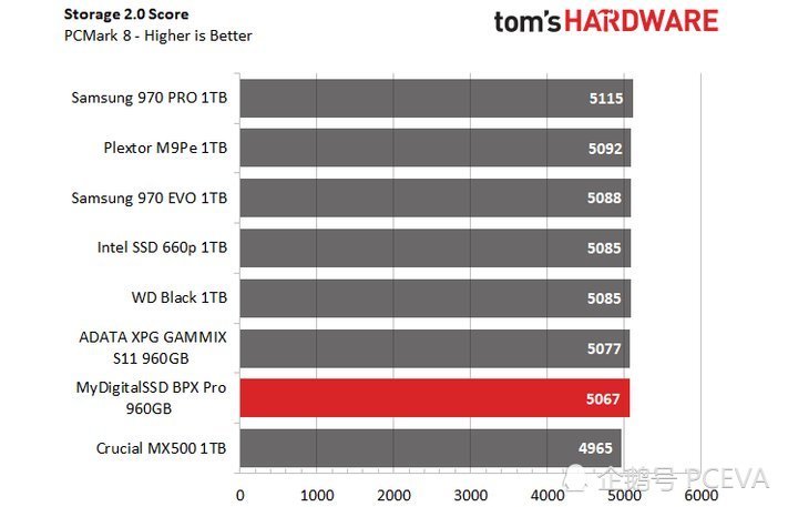 接下来是坏消息. E12主控制器在顺序读写中表现出强大功能,在实际应用测试中表现不佳. 在比较的几个NVMe SSD中,PCMark 8存储测试得分排名最后:
