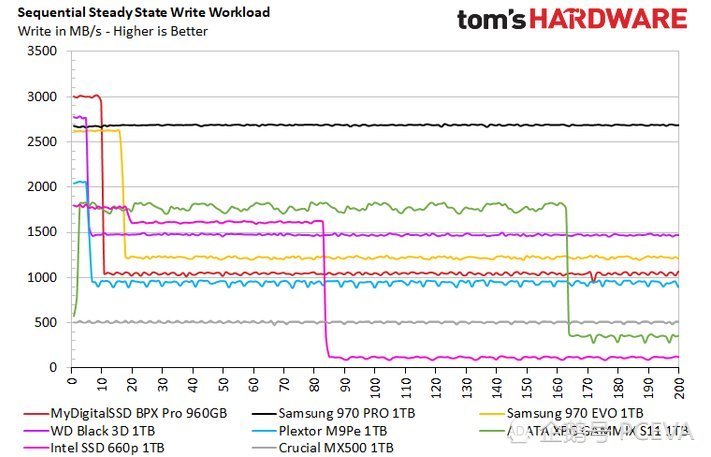 超出SLC缓存范围后,BPX Pro的顺序写入速度介于Plextor M9Pe和Western Digital Black Disk 3D之间,后者也使用东芝BiCS3闪存. 这里的比较是1T容量的竞争对手. 下图中的横轴是时间. 同时,我们还可以看到两个MLC闪存固态驱动器Samsung 970Pro和Inruida MX500始终都是快速释放的,而使用完整SLC算法的ADATA XPG GAMMIX S11和Intel 660p前部,后部呆滞.