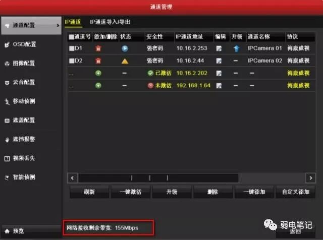 录像机的本地“网络接收的剩余带宽”是剩余的访问带宽. 如果剩余带宽小于摄像机的比特率,则无法添加.