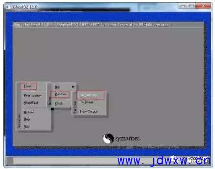 重新启动系统,使用U盘等启动盘进入PE系统,找到Ghost程序,然后选择local——Partition——To Partition