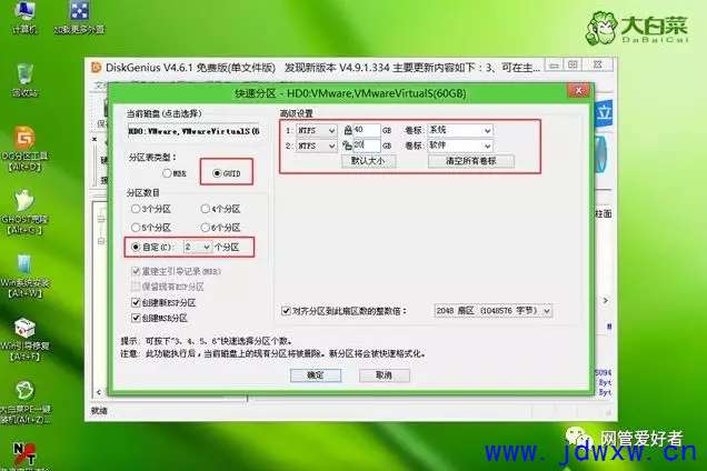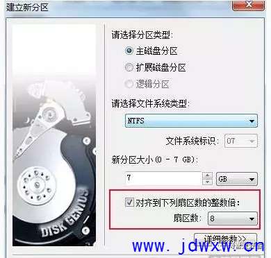 6. 选择[GUID]作为GPT分区表类型,然后设置分区数. 分区数是可定制的. 固态磁盘的容量很小. 通常,一个分区就足够了. 设置系统磁盘的大小,至少50G或更多,固态磁盘选中[将分区对齐到此扇区],默认的扇区数可以是4k对齐,确定;