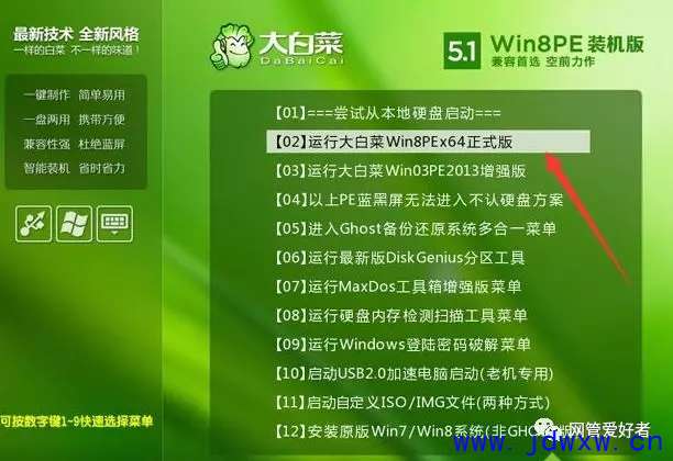 4. 由于生产方法不同,某些uefi pe启动盘会直接进入pe系统,有些会首先显示pe主菜单. 如果显示以下界面,请选择[02]输入以运行win8PEx64的正式版;