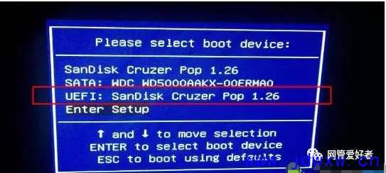 3. 重新启动后,请继续按F12或F11或Esc和其他快捷键. 不同的计算机启动键是不同的. 技嘉主板是F12. 在弹出的启动项目选择框中,选择识别的U盘选项. UEFI引导项,选择uefi项,按Enter键从uefi引导;