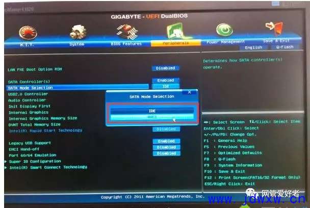 2. 将USB闪存驱动器插入具有固态驱动器的计算机. 为了利用固态驱动器的速度,请首先进入BIOS以打开硬盘驱动器的AHCI模式. 以技嘉主板为例. 启动计算机时,按Del键进入BIOS界面,然后切换到. 在Peripherals界面中,选择SATA Mode Selection,然后按Enter键,选择AHCI进入,按F10键保存并重新启动,然后检查其他主板: 如何开机BIOS中的ahci模式;