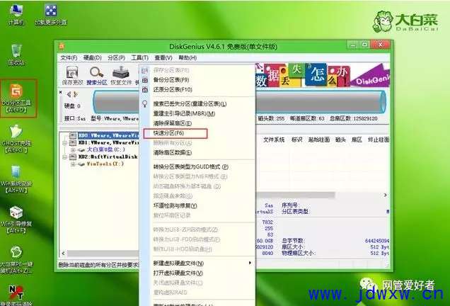 5. 进入pe系统后,双击桌面上的[DG Partition Tool],右键单击以选择固态驱动器(通常是带有SSD的项目),然后单击[Quick Partition];