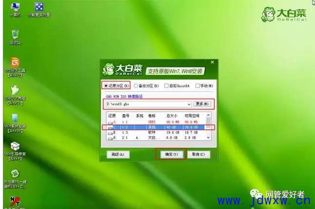 9. 然后选择[还原分区],选择系统安装位置,通常为C盘,如果不是C盘,则根据卷标选择[系统]或硬盘大小,单击确定;