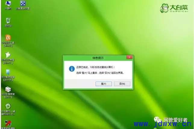 12. 操作完成后,将提示计算机即将重启,默认为10秒钟后自动重启,或单击“是”重启计算机;