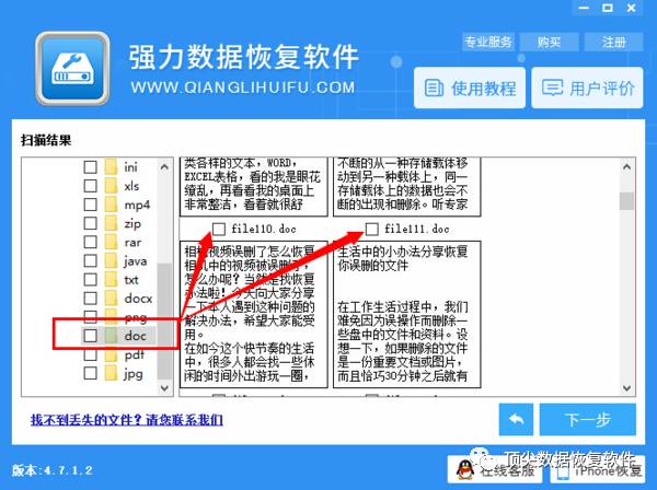 5. 扫描完成后,请选择要恢复的数据类型“图片,文档,视频”等,然后借助软件的文件预览功能查看数据,查找并检查要恢复的数据文件,然后单击“下一步””.