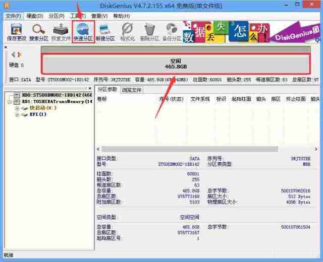 2. 硬盘空闲时,单击“快速分区”按钮对硬盘进行分区,如下图所示