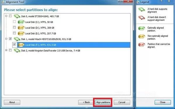 如果显示,则表示没有4K对齐. 具体操作是选择未对齐的硬盘,勾选它,然后单击下面的“对齐分区”,如下图所示.